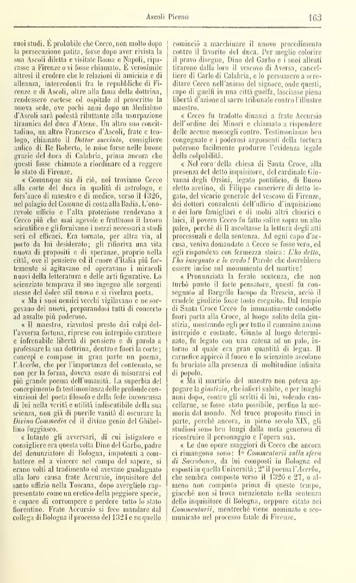 suoi studi. È probabile che Cecco, non molto dopo la persecuzione patita, forse dopo aver rivista la sua Ascoli diletta e visitate Roma e Napoli, riparasse a Firenze o vi fosse chiamato. E verosimile altresì il credere che le relazioni di amicizia e di alleanza, intercedenti fra le repubbliche di Firenze e di Ascoli, oltre alla fama della dottrina, rendessero cortese ed ospitale al proscritto la nuova sede, ove pochi anni dopo un Medialuso d'Ascoli sarà podestà riluttante alla usurpazione tirannica del duca d'Atene. Un altro suo concittadino, un altro Francesco d'Ascoli, frate e teologo, chiamato il Dottor saccinto, consigliere aulico di Ite Roberto, lo mise forse nelle buone grazie del duca di Calabria, prima ancora che (piesti fosse chiamato a riordinare ed a reggere lo stato di Firenze.