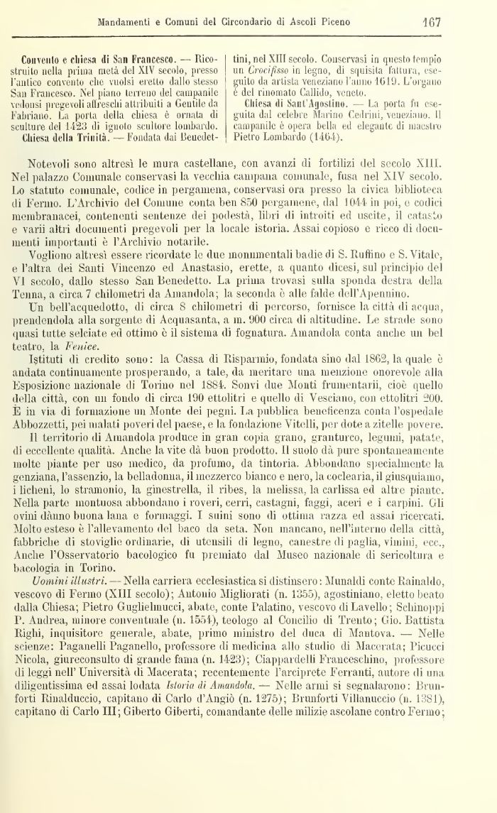 Uomini illustri. — Nella carriera ecclesiastica si distinsero: Munaldi conte Rainaldo, vescovo di Fermo (XIII secolo); Antonio Migliorati (n. 1355), agostiniano, eletto beato dalla Chiesa; Pietro Guglielmucci, abate, conte Palatino, vescovo di Lavello; Sellino]spi I'. Andrea, minore conventuale (11. 1554), teologo al Concilio di Trento; Gio. Battista Righi, inquisitore generale, abate, primo ministro del duca di Mantova. — Nelle scienze: Paganelli Paganello, professore di medicina allo studio di Macerata; Picucci Nicola, giureconsulto di grande fama (n. 1423); Ciappardelli Francescano, professore di leggi noli' Università di Macerata; recentemente l'arciprete Ferranti, autore ili una diagentissima ed assai lodata kloria di Amandola. — Nelle armi si segnalarono : Brun-forti Rinalduccio, capitano di Carlo d'Angiò (n. 1275); Brunforti Villanttccio (11. 1381), capitano di Carlo III; Giberto Giberti, comandante delle milizie ascolane contro Fermo;