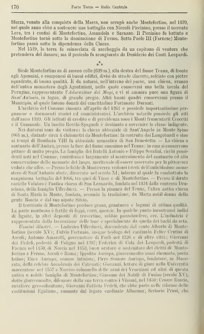 Uomini illustri. — Lodovico UHVedueci, discendente dal conte Alberto di Monte-fortino (secolo X\ ); Fulvio Fortauiio, insigne teologo del cardinale Felice Contini di Ascoli; Antonio Amaretti, governatore di l'orli nel I32G i di altre città; (ìiovaniii dei Fedeli, poti està ili Foligno nel 1307; Federico di Cola dei Leopardi, podestà di Faenza nel 1450, di Norcia nel 1153, buon oratore e sostenitore dei diritti di Monte-fortino a Fermo, Ascoli e Roma; Ippolito Aurispa, giureconsulto assai rinomato, poeta latino; Enea Aurispa, sommo latinista; Pirro Seniore Aurispa, fondatore, in Macerata, della celebre Accademia dei Catenati; Giovanni, lettore di giure nella Università maceratese Iti 1 1557 e Narciso colonnello delle armi dei Veneziani ed altri di questa antica e nobile famiglia ili Montefortino; Giacomo dei Nobili di 1 usino (secolo XV), dotto giureconsulto, difensore della sua terra contro i Vissani, nel 1450; Cesare Roscio, cavaliere gerosolimitano; Giovanni Battista Fedeli, che ebbe parte nelle riforme delle costituzioni Egidìane, emanate dal legato cardinale Albornoz; $e:l'Iorio Pruni, clic