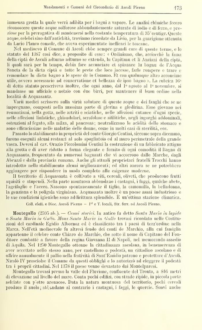 Montegallo (2595 ab.). — Cenni storici. In antico fu detto Sunta Maria in lapide o Seuil a Maria in Gallo. Mons Sanici Maria in Cullo trovasi ricordato nelle Costituzioni del cardinale Egidio Albornoz ed è classificato tra i paesi di terz'ordine nella Marca. Nell'età medioevale fu altresì feudo dei conti de Marchio, alla cui famiglia appartenne il celebre conte Chiaro de Marchio, che sotto il nome di Capitano del Tonditore combattè a favore della regina Giovanna 11 ili Napoli, nel memorando assedio di Aquila. Nel 1250 Montegallo ottenne la cittadinanza ascolana, in benemerenza ili aver accettato nello stesso anno, per castellano o podestà, un cittadino ascolano e ili offrire annualmente il pallio nella festività di Sant'Emidio patrono e protettore d'Ascoli. Nicolò IV prosciolse il Connine da questi obblighi e lo autorizzò ad eleggere il podestà tra i proprii cittadini. Nel 1378 il paese venne devastato dai Montelparesi.