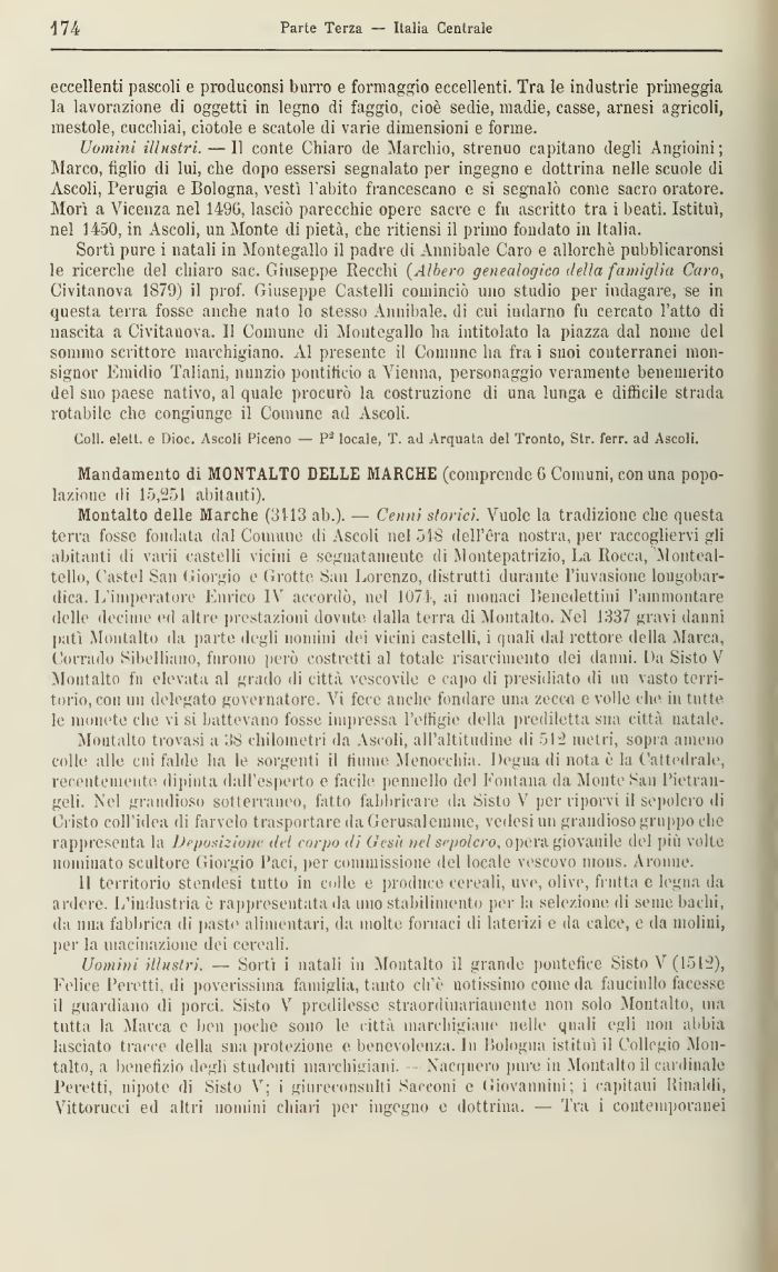 Uomini illustri. — 11 conte Chiaro de Marchio, strenuo capitano degli Angioini; Marco, figlio di lui, che dopo essersi segnalato per ingegno e dottrina nelle scuole di Ascoli, Perugia e ISologna, vestì l'abito francescano e si segnalò come sacro oratore. Morì a Vicenza nel 14%, lasciò parecchie opere sacre e fìi ascritto tra i beati. Istituì, nel 1450, in Ascoli, un Monte di pietà, che ritienisi il primo fondato in Italia.