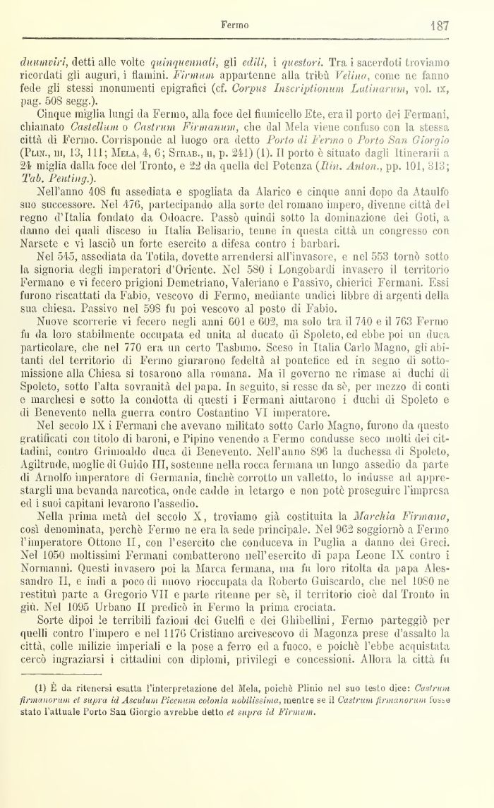 (1) È da ritenersi esatta l'interpretazione del Mela, poiché Plinio nel suo testo dice: Castrum finnanoritm et supra id Asculum Picenum colonia nobilissima, mentre se il Castrum fionanorum fosba stato l'attuale Purto Sau Giorgio avrebbe detto et supra id Firmum.