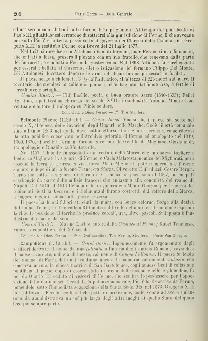 Campotìlone (1510 ab.). — Cenni storici. Ingegnosamente fu argomentato dagli scrittori derivare il nome da una fnlloniu o tintoria degli antichi Romani, trovandosi il paese ricordato, nell'età di mezzo, col nome di Campo Fidlonum. Il paese fu feudo dei monaci di Far fa. dei quali continua ancora la memoria col nome di Abbazia, che conserva ancora la chiesa matrice di San Bartolomeo, cogli annessi beni di collazione pontificia, 11 paese, dopo di essere stato in preda delle fazioni guelfe e ghibelline, fu poi da Onorio 111 ceduto ai vescovi di l'ermo, che sembra lo perdessero per l'opposizione l'atta dai monaci. Decaduta la potenza monacale, Pio V lo distaccava da Ferino, ponendolo sotto l'immediata soggezione della Santa Sede. Via nel 1573, Gregorio VIIL lo restituiva a Fermo, cogli antichi patti di protezione, onde venne ad avere un'autonomia amministrativa un po' più larga degli altri luoghi di quello Stato, del quale fece poi sempre parte.