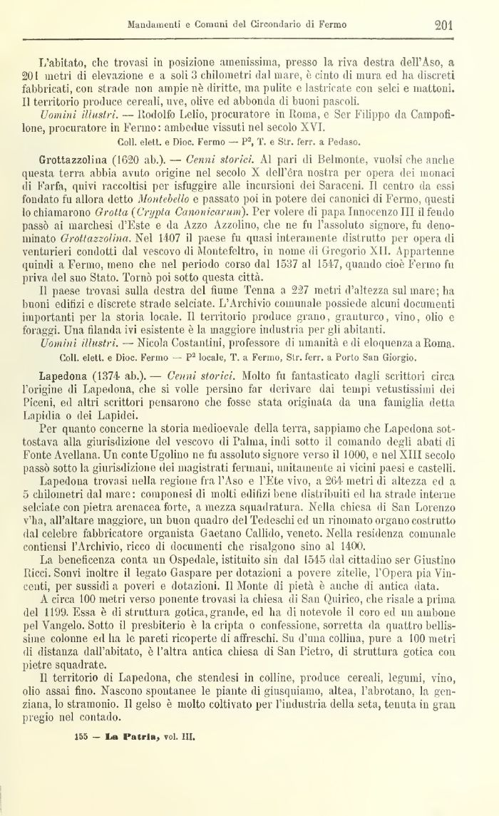 Lapedona (1374 ab.). — Cenni storici. Molto fu fantasticato dagli scrittori circa l'origine di Lapedona, che si volle persino far derivare dai tempi vetustissimi dei Piceni, ed altri scrittori pensarono che fosse stata originata da una famiglia detta Lapidia o dei Lapidei.