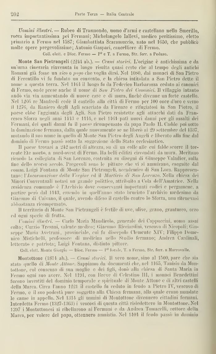Monte San Pietrangeli (2244 ab.). — Cenni storila. L'origine è antichissima e da un'urna cineraria rinvenuta in luogo risulta quasi certo che al tempo degli antichi Romani già fosse un vico o pago che voglia dirsi. Nel 10t-0, dai monaci di San Pietro ili Ferentino vi fu fondato un convento, e la chiesa intitolata a San Pietro dette il nome a questa terra. Xel 1161 il luogo fu da Federico lìarbarossa ceduto ai canonici di Fermo, onde prese anche il nome ili Sun Pietro dei Canonici. 11 villaggio intanto andò via via aumentando di nuove case e di mura, finché divenne un forte castello. Xel 1266 re Manfredi cede il castello alla città di Ferino per 100 once d'oro e verso il 1276, da Laniero degli Agli scacciato da Firenze e rifugiatosi in San Pietro, il paese ebbe l'aggiunta degli Agli. San Pietro resistette agli attacchi dati da Francesco Sforza negli anni 1113 e 1144, e nel 1161 pati nuovi danni per gli assalti dei Feriuani, ilei quali danni fu il paese ricompensato da papa Paolo IL Cadile poi sotto la dominazione fermami, dalla quale nuovamente se ne liberò ai 29 settembre del 1537, muta lido il suo nome in quello di .Monte San Pietro degli Angeli e liberato alla fine dal dominio di Fermo passò sotto la soggezione dello Stato ecclesiastico.