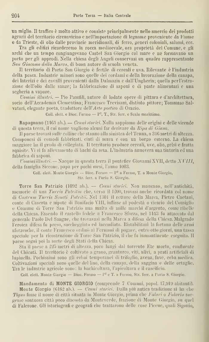 Torre San Patrizio (10Ù2 ab.). — Cenni storici. Non mancano, nel]'antichità, memorie di una Trums Fatritiu clic, verso il 1200, trovasi anche ricordata col nome di Cast rum Turris Sondi l'atritii. Nel 1301 il rettore della Marca, Pietro Caetani, conte di Caserta e nipote di Bonifacio VIII, inflisse al podestà o vicario del Consiglio e Comune di Torre San Patrizio lina multa di mille marchi d'argento, come ribelle della Chiesa. Essendo il castello fedele a Francesco Sforza, nel 1113 fu attaccato dal generale Paolo Del Sangue, che trovavasi nella Marca a difesa della Chiesa. Malgrado l'eroica difesa fu preso, saccheggiato ed incendiato. Ristabilitasi la fortuna delle armi sforzesche, il conte Francesco ordini) ai Fenuaiii eh pagare, entro otto giorni, una tassa speciale per la ricostruzione di Torre San Patrizio, il che fu immantinente eseguito. 11 paese segui poi la sorte degli Stati della Chiesa.
