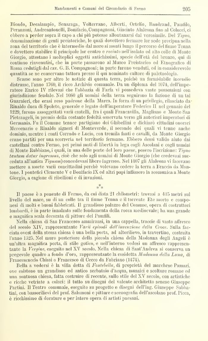 Biondo, Decalampio, Senaraga, Volterrano, Alberti, Ortelio, Baudraud, Paintìlo, Peranzoni, Andreantonelli, Bonifacio, Compagnoni, Giacinto Alaleona fino al Colucci, ci ebbero a perder sopra il capo a clu più potesse allontanarsi dal verosìmile. Del Tigno, denominazione di genti preistoriche, le quali dovettero fermare lor sede precipua nella zona del territorio elle è intermedio dal mare ai monti lungo il percorso del limile Tcnna e dovettero stabilire il principia lor centro e rm'nM Bell'isolato ed alto colle di Monte Giorgio, attestano i molteplici oggetti antichissimi, specie dell'età del bronzo, qui di continuo rinvenutisi, che in parte passarono al Museo Preistorico ed Etnografico di Roma cedutigli dal cav. G. B. Compagnoni; in parte furono venduti, ed in considerevole quantità se ne conservano tuttora presso il qui nominato cultore di paletnologia
