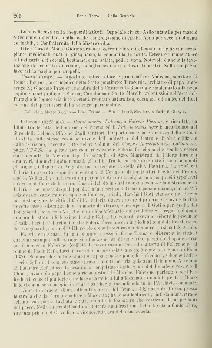 Falerone (4223 ah.). — Cenni storici. Valeria, o Falerio Picenus, è ricordata da Plinio tra le città dell'interno del Piceno ed il Falerionensis ager è menzionato nel libro delle Colonie. l'in che dagli scrittori, l'importanza e la grandezza della città ù attestata dalle stesse cospicuo rovine dell'antiteatro, del teatro e di altri edilizi, e dalle iscrizioni, raccolte tutte nel i\- volume del Corpus Inscripiimium Latinorum, juigg. r>17-.-j25. Da queste iscrizioni rilevasi che Faleria fu colonia che sembra essere stata dedotta da Augusto dopo la battaglia di Azio. Magistrati di Faleria furono i duumviri, duumviri quinquennali, gli edili. Tra le cariche sacerdotali sono nominati gli auguri, i flamini di Augusto, una sacerdotessa della diva Faustina. La tribù cui Faleria fu ascritta è quella medesima di Fermo e di molti altri luoghi del Piceno, cioè la Velina. La città aveva un perimetro di circa 2 miglia, non compresi i sepolcreti ch'erano al fuori delle mura. È assai dubbio in qnal tempo avvenisse la distruzione di Faleria e per opera di quali popoli. Da un rescritto di (ielasio papa abbiamo, che nel IO.» esìsteva mia cattedra episcopale in Faleria; quindi, allorché i Goti giunsero nel Piceno per distruggere le città (405 di C.) Faleria doveva avere il proprio vescovo e la città dovette essere distrutta dopo la morte di Alarico, o per opera di Goti o per quella dei Longobardi, nel secolo VI; il che sarebbe all'ormato dal pontefice S. Gregorio, il quale deplora lo stato infelicissimo in cui e (ioti e Longobardi avevano ridotte le Provincie d'Italia. Però il Colitici opinò che Faleria fosse ancora in piedi ai tempi di Desiderio re dei Longobardi, cioè, nel] Vili secolo e che la sua rovina deliba cercarsi nel X secolo.