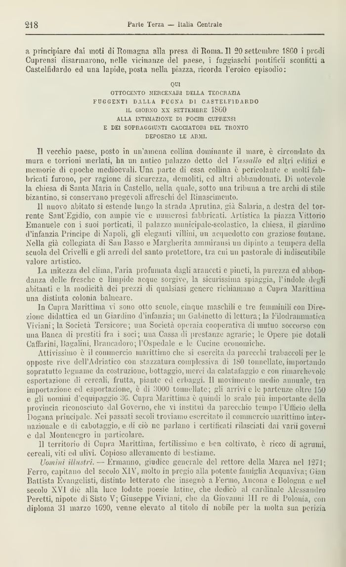 La mitezza del clima, l'aria profumata dagli aranceti e pinoti, la purezza ed abbondanza delle fresche c limpide acque sorgive, la sicurissima spiaggia, l'indole degli abitanti e la modicità dei prezzi di qualsiasi genere richiamano a Cupra Marittima una distinta colonia balneare.