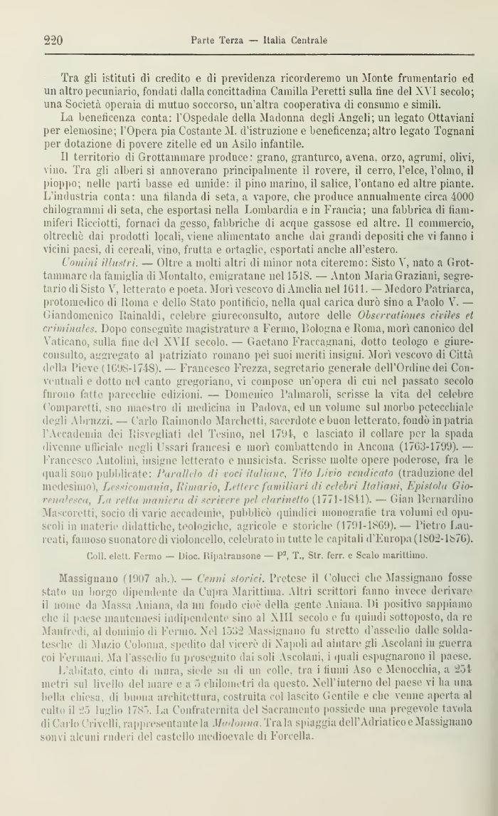 Coni ini iUitsIM — Oltre a molti altri di minor nota citeremo: Sisto V, nato a Grottammare da famiglia di Montalto, emigratane nel 1518. — Anton Maria Oraziani, segretario di Sisto V, letterato e poeta. Mori vescovo di Amelia nel 1611. — Medoro Patriarca, protomedico di l'orna e dello Stato pontificio, nella qual carica durò sino a Paolo V. — Giandomenico Ilainaldi, celebre giureconsulto, autore delle Obscrraliones civiles et criminales. Dopo conseguite magistrature a Fermo, Bologna e Roma, morì canonico del Vaticano, sulla fino del X\ II secolo. — Gaetano Fraccagnani, dotto teologo e giureconsulto, aggregato al patriziato romano pei suoi meriti insigni. Morì vescovo di Città della Pieve (1G98-174S). — Francesco Frezza, segretario generale dell'Ordine dei Conventuali e dotto nel canto gregoriano, vi compose un'opera di cui nel passato secolo fwo.no l'atte parecchie edizioni. — Domenico Palmaroli, scrisse la vita del celebre Comparetti. suo maestro di medicina in Padova, ed un volume sul morbo petecchiale degli Abruzzi. — Carlo Raimondo Marchetti, sacerdote e buon letterato, fondò in patria l'Accademia dei Risvegliati del Tesino, nel 1791, e lasciato il collare per la spada divenne ufficialo negli Ussari francesi e morì combattendo in Ancona (1703-1799). — Francesco Antolinì, insigne letterato e musicista. Scrisse molte opere poderose, fra le quali sono pubblicate: Parallelo (lì voci italiane, l'Ho Livio vendicato (traduzione del medesimo), Lesticomania, Rimario, Lettere familiari di celebri Italiani, Epistola tìio-renalesca, La retta maniera di scrivere pel clarinetto (1771-1841). — Gian Bernardino Mascoretti, socio di varie accademie, pubblicò quindici monografie tra volumi ed opuscoli in materie didattiche, teologiche, agricole e storiche (17D1-1869). — Pietro Laureati, famoso suonatore di violoncello, celebrato in tutte le capitali d'Europa (1802-lì>76).
