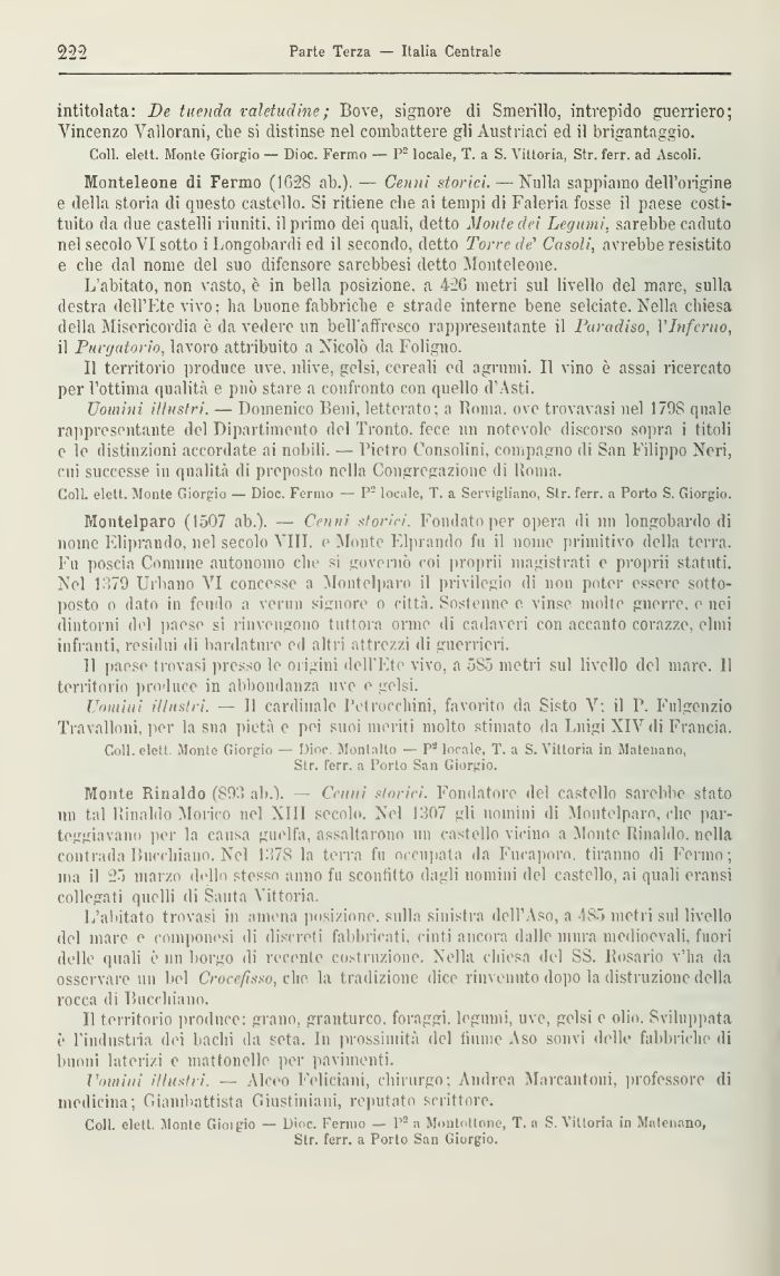 Uomini illustri. — Domenico Beni, letterato; a Roma, ove trovavasi nel 179S (piale rappresentanti del Dipartimento del Tronto, fece nn notevole discorso sopra i titoli e io distinzioni accordate ai nobili. — Pietro Consolini, compagno di San Filippo Neri, cui successe ili qualità di preposto nella Congregazione di Roma.