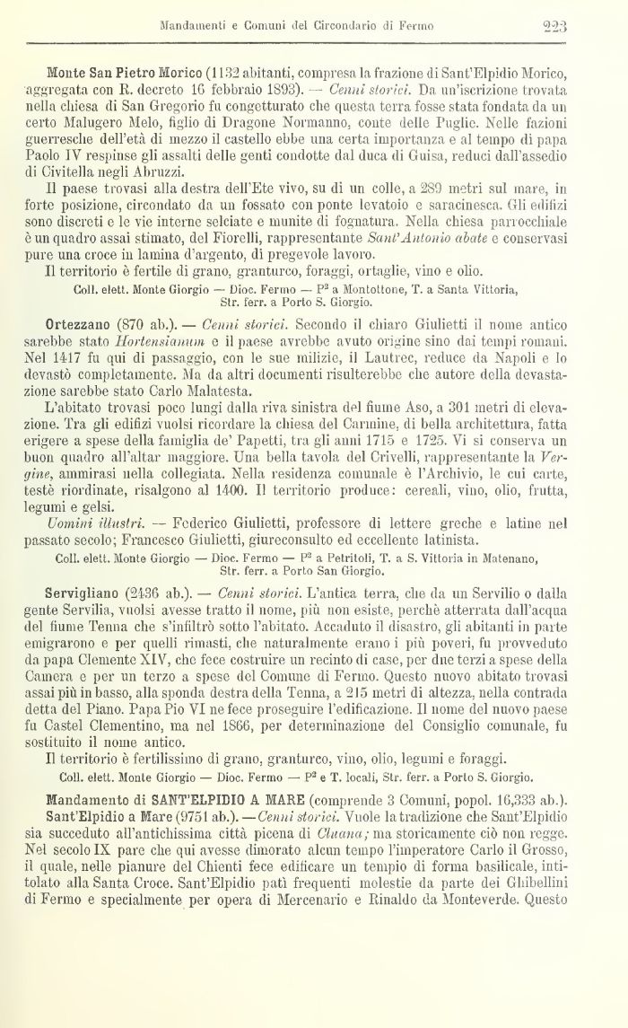 Servigiiano (2436 ab.). — Cenni storici. L'antica terra, che da un Servilio o dalla gente Servilia, vuoisi avesse tratto il nome, più non esiste, perchè atterrata dall'acqua del fiume Tenna che s'infiltrò sotto l'abitato. Accaduto il disastro, gli abitanti in parte emigrarono e per quelli rimasti, che naturalmente erano i più poveri, fu provveduto da papa Clemente XIV, che fece costruire un recinto di case, per due terzi a spese della Camera e per un terzo a spese del Comune di Fermo. Questo nuovo abitato trovasi assai più in basso, alla sponda destra della Tenna, a 215 metri di altezza, nella contrada detta del Piano. Papa Pio VI ne fece proseguire l'edificazione. Il nomo del nuovo paese fu Castel Clementino, ma nel 1866, per determinazione del Consiglio comunale, fu sostituito il nome antico.