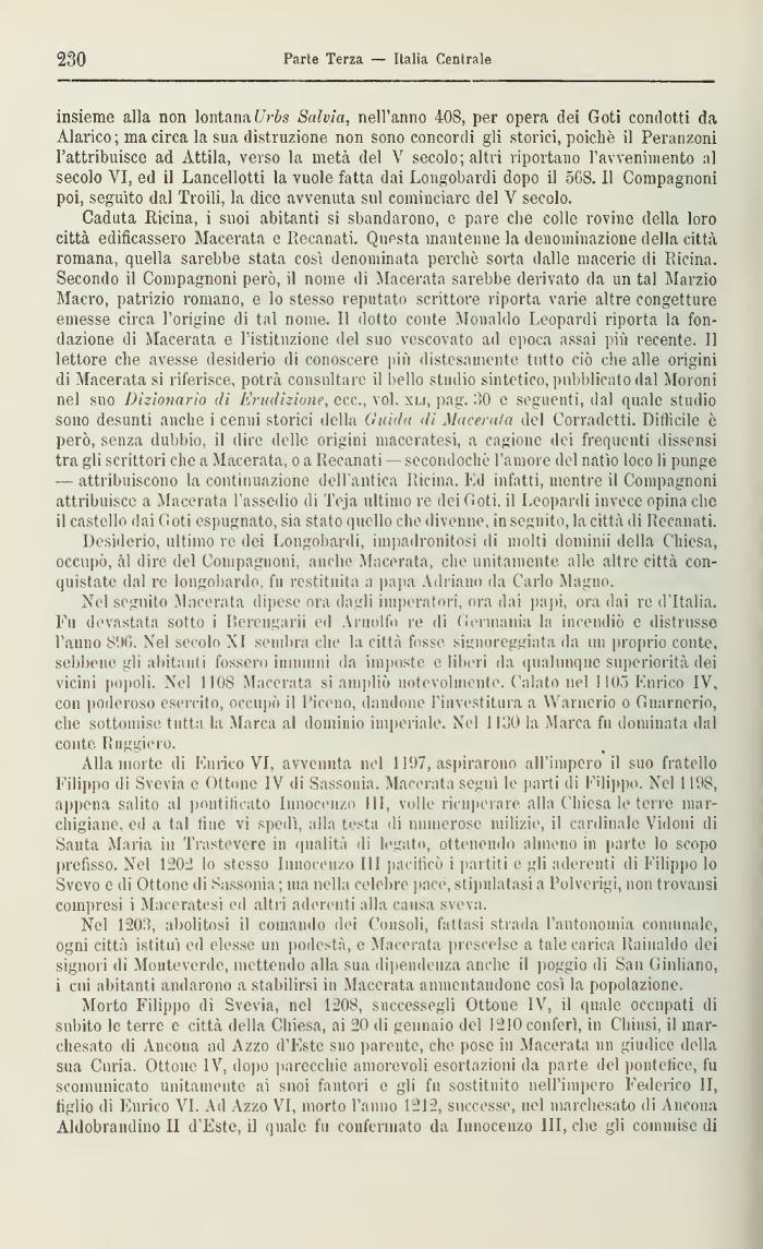 Caduta Ricina, 1 suoi abitanti si sbandarono, e pare che colle rovine della loro città edificassero Macerata e Recanati. Questa mantenne la denominazione della città romana, quella sarebbe stata così denominata perchè, sorta dalle macerie di Ricina. Secondo il Compagnoni però, il nome di Macerata sarebbe derivato da un tal Marzio Macro, patrizio romano, e lo stesso reputato scrittore riporta varie altre congetture emesse circa l'origine di tal nome. Il dotto conte Monaldo Leopardi riporta la fondazione di Macerata e l'istituzione del suo vescovato ad epoca assai più recente. Il lettore che avesse desiderio di conoscere più distesamente tutto ciò che alle origini di Maceratasi riferisce, potrà consultare il bello studio sintetico, pubblicato dal Moroni nel suo Dizionario di Erudizione, ecc., voi. xli, pag. 30 e seguenti, dal quale studio sono desunti anche i cenni storici della Guida di Macerala del Corradetti. Difficile è però, senza dubbio, il dire delle origini maceratesi, a cagione dei frequenti dissensi tra gli scrittori che a Macerata, o a Recanati — secondochò l'amore del natio loco li punge — attribuiscono la continuazione dell'antica Ricina. Ed infatti, mentre il Compagnoni attribuisce a Macerata l'assedio di' Teja ultimo re dei Goti, il Leopardi invece opina che il castello dai Goti espugnato, sia stato quello che divenne, inseguito, la città di Recanati.