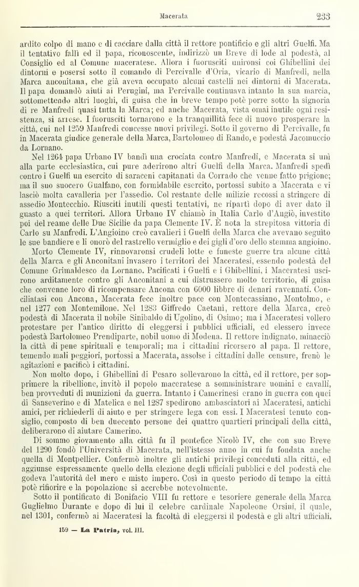 ardito colpo di mano e di cacciare dalla città il rettore pontificio e gli altri Guelfi. Ma il tentativo fallì ed il papa, riconoscente, indirizzò un Breve di lode al podestà, al Consiglio ed al Comune maceratese. Allora i fuorusciti tiuironsi coi Ghibellini dei dintorni o posersi sotto il comando di Percivalle d'Oria, vicario di Manfredi, nella Marca anconitana, che già aveva occupato alcuni castelli nei dintorni di Macerata. B papa domandò aiuti ai Perugini, ma Percivalle continuava intanto la sua marcia, sottomettendo altri luoghi, di guisa che in breve tempo potò porre sotto la signoria dì re Manfredi quasi tutta la Marca; ed anche Macerata, vista oniai inutile ogni resistenza, si arrese. I fuorusciti tornarono e la tranquillità fece di nuovo prosperare la città, cui nel 1259 Manfredi concesse nuovi privilegi. Sotto il governo di Percivalle, fu in Macerata giudice generale della Marca, Bartolomeo di Bando, e podestà Jacoinuccio da Lornano.