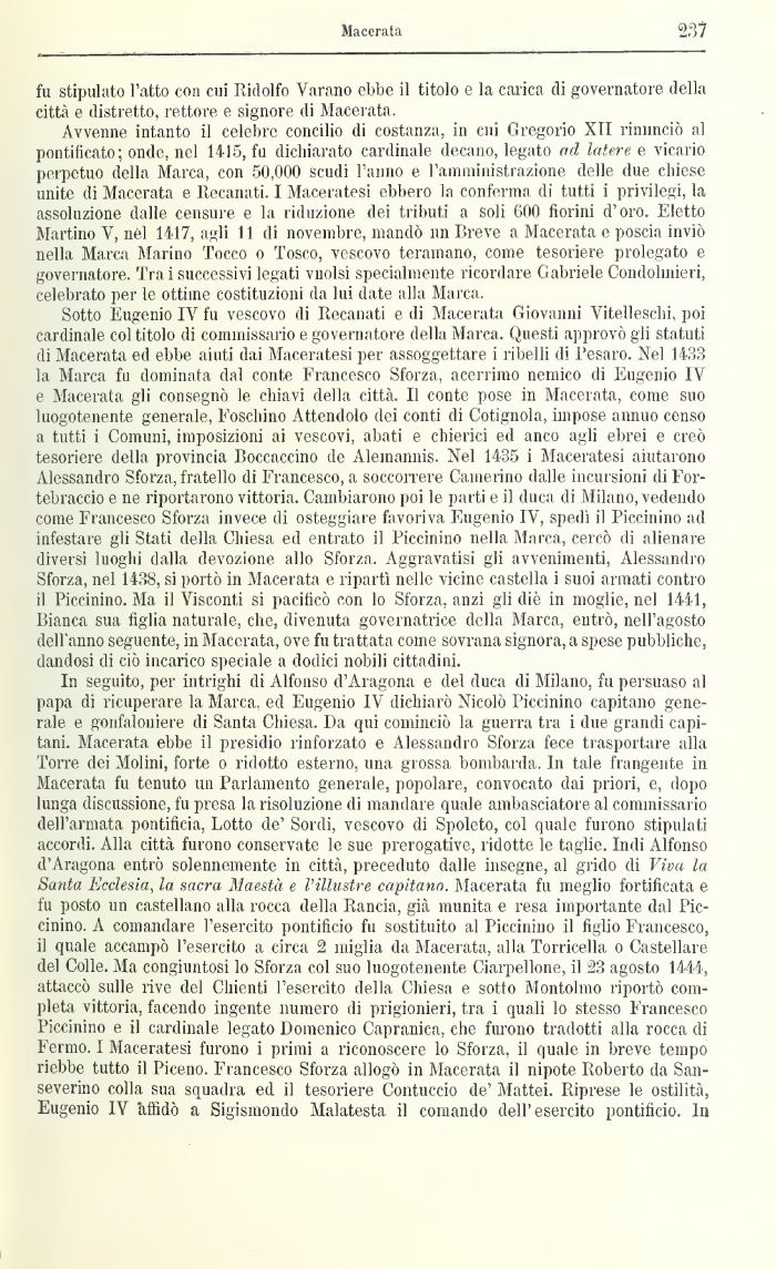 Sotto Eugenio IV fu vescovo di Recanati e di Macerata Giovanni Vitelleschi. poi cardinale col titolo di commissario e. governatore della Marca. Questi approvò gii statuti di Macerata ed ebbe aiuti dai Maceratesi per assoggettare i ribelli di Pesaro. Nel 1433 la Marca fu dominata dal conte Francesco Sforza, acerrimo nemico di Eugenio IV e Macerata gli consegnò le chiavi della città. Il conte pose in Macerata, come suo luogotenente generale, Foschino Attendo!© dei conti di Cotignola, impose annuo censo a tutti i Comuni, imposizioni ai vescovi, abati e chierici ed anco agli ebrei e creò tesoriere della provincia Boccaccino de Alemannis. Nel 1435 i Maceratesi aiutarono Alessandro Sforza, fratello di Francesco, a soccorrere Canterino dalle incursioni di For-tebraccio e ne riportarono vittoria. Cambiarono poi le parti e il duca di Milano, vedendo come Francesco Sforza invece di osteggiare favoriva Eugenio IV, spedì il Piccinino ad infestare gli Stati della Chiesa ed entrato il Piccinino nella Marca, cercò di alienare diversi luoghi dalla devozione allo Sforza. Aggravatisi gli avvenimenti, Alessandro Sforza, nel 1438, si portò in Macerata e ripartì nelle vicine castella i suoi armati contro il Piccinino. Ma il Visconti si pacificò con lo Sforza, anzi gli die in moglie, nel 1441, Bianca sua figlia naturale, che, divenuta governatóre della Marca, entrò, nell'agosto dell'anno seguente, in Macerata, ove fu trattata come sovrana signora, a spese pubbliche, dandosi di ciò incarico speciale a dodici nobili cittadini.