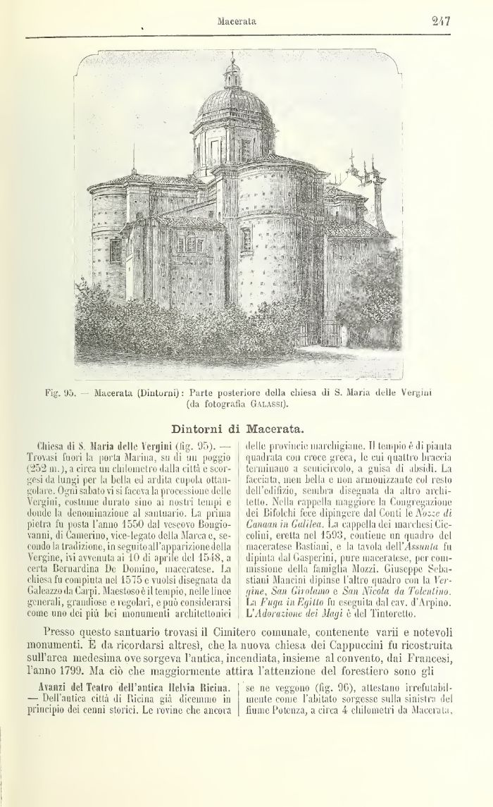 (Mesa di S. Maria delle Virgili (%• ,S£j» — Trovasi fu uri fa porta Marina, su ili un poggio (252 m.), a circa un chilometro dalla città e scorgasi da lungi per la bella iti ardita cupola ottangolare. Ogni sabato vi si faceva la processione delle Vergini, costume durato sino ai nostri tempi e donde la denominazione al santuario. La prima pietra fu posta l'anno 1550 dal vescovo tiongio-vanni, di Camerino, vice-legato della Marca e, secondo la tradizione, in seguito all'apparizione della Vergine, ivi avvenuta ai 10 di aprile del 1548, a certa lìernardina De Domino, maceratese, La chiesa fu compiuta nel 1575 e vuoisi disegnata da Galeazzo da Carpi. Maestosoè il tempio, nelle linee generali, grandiose e regolali, e può considerarsi come uno dei più bei monumenti archilettonici