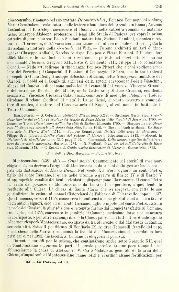Buìliogkafia. — G. Colucci, Iil Antichità Picene, torno XXV. — Girolamo Maria Vico, Descrizione istoriea dell'origine ed erezione del tempio di Santa Maria delle Veri/ini di Macerata, 1790. — Domenico Traili* Dissertazione dell'antica città di liecina. Macerata 1790. — Giacomo Lauro, Macerata illustrata con memorie pia ciliare della eittà. Roma 164-2. — Giovanni Andrea Massei, De Macerata urbe in Piceno. Elegia, 171G. — Pompeo Compagnoni, Notizia della zecca di Macerata. — Filippo Bruti Liberati, Inedito clcneo dei podestà di Maccruta. Ripatransone 1813. — Moroni, in Dizionario di Erudizione, torno XLI, pagg. 5-92. — Conventati, Della natura e qualità delle diverse terre del territorio maceratese. Macerata 1781. — R. Foglietti, Cenni storici sull' Università di Macerata. Macerata 1S78. — C. Corradetti, Guida stor ieo-ilhist rat iva di Macerata. Sanseverino 1878.