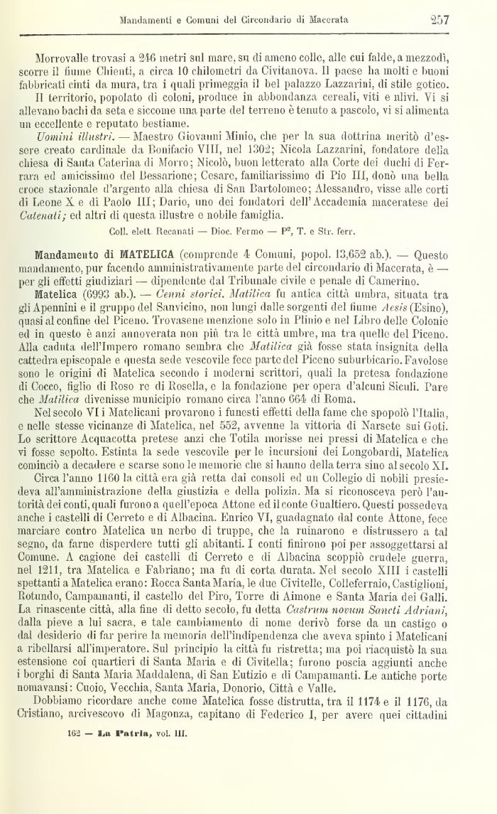 Mandamento di MATELICA (comprende 4 Comuni, popol. 13,052 ab.). — Questo mandamento, pur facendo amministrativamente parte del circondario di Macerata, è — per gli effetti giudiziari — dipendente dal Tribunale civile e penale di Camerino.
