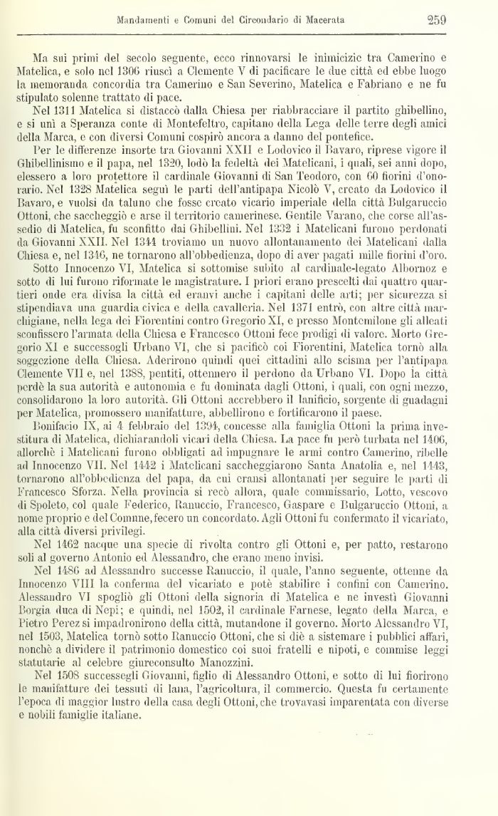 Bonifacio IX, ai 4 febbraio del 1394, concesse alla famiglia Ottoni la prima investitura di Matelica, dichiarandoli vicari della Chiesa. La pace fu però turbata nel 1406, allorché i Matelicani furono obbligati ad impugnare le anni contro Camerino, ribelle ad Innocenzo VII. Nel 1442 ì Matelicani saccheggiarono Santa Anatolia e, nel 1443, tornarono all'obbedienza del papa, da cui eransi allontanati per seguire le parti di Francesco Sforza. Nella provincia si recò allora, quale commissario, Lotto, vescovo di Spoleto, col quale Federico, Ranuccio, Francesco, Gaspare e Bulgaruccio Ottoni, a nome proprio e del Connine, fecero un concordato. Agli Ottoni fu confermato il vicariato, alla città diversi privilegi.