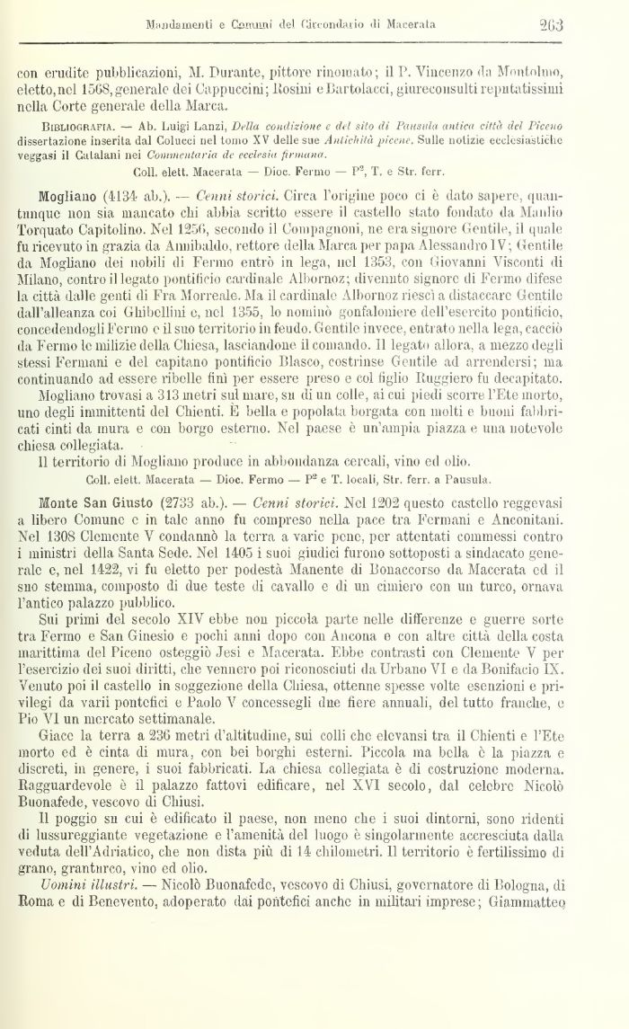 Monte San Giusto (2733 ab.). — Cenni storici. Nel 1202 questo castello reggevasi a libero Comune e in tale anno fu compreso nella pace tra Permani e Anconitani. Nel 1308 Clemente V condannò la terra a varie pene, per attentati commessi contro 1 ministri della Santa Sede. Nel 1405 i suoi giudici furono sottoposti a sindacato generale e, nel 1422, vi fu eletto per podestà Manente di Bonaccorso da Macerata ed il suo stemma, composto di due teste di cavallo e di 1111 cimiero con 1111 turco, ornava l'antico palazzo pubblico.