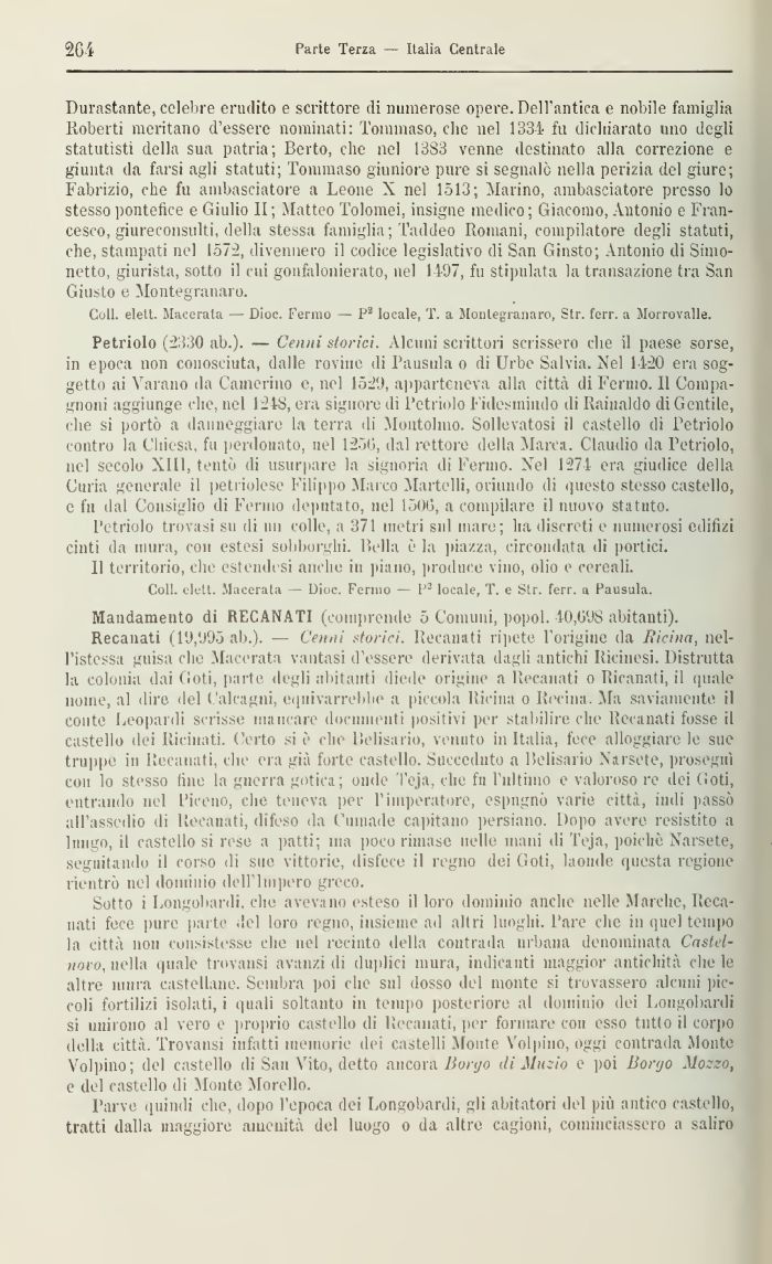 Petriolo (2330 ab.). — Cenni storici. Alcuni scrittori scrissero che il paese sorse, in epoca non conosciuta, dalle rovine di Pausula o di Urbe Salvia. Nel 1420 era soggetto ai Varano da Camerino e, nel 1529, apparteneva alla città di Ferino. Il Compagnoni aggiunge che, nel 1218, era signore di Petriolo I- idesmiudo di Raijiaklo di Gentile, che si portò a danneggiare la terra di Montolmo. Sollevatosi il castello di Petriolo contro la Chiesa, fu perdonato, nel 1250, dal rettore della Marca. Claudio da Petriolo, nel secolo XIII, tentò di usurpare la signoria di Pernio. Nel 1271- era giudice della Curia generale il petriolese Filippo Marco Martelli, oriundo di questo stesso castello, e fu dal Consiglio di Fermo deputato, nel 1506, a compilare il nuovo statuto.