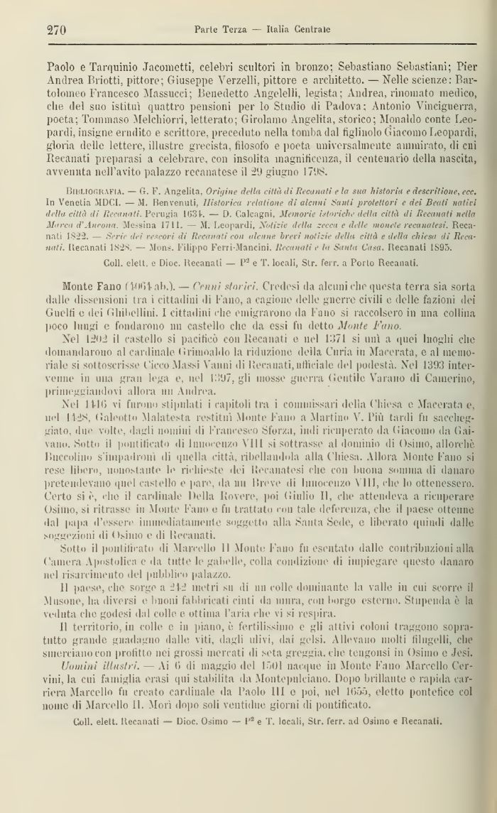 2-20 Coli, elelt. e Dioc. Hecanati — Pa e T. locali, Str. ferr. a Porto Recanati. Monte Fano fWlfìlab.). — Cenni fiorici. Orodesi da alcuni die questa terra sia sorta dalle dissensioni tra i cittadini di Fano, a cagione delle guerre civili e delle fazioni dei Guelfi e dei Ghibellini. 1 cittadini che emigrarono da Fano si raccolsero in ima collina poco lungi e fondarono ini castello clic da essi fu detto Monte Fano. Nel 1202 il castello si pacificò con llecanati e nel 1371 si unì a miei luoghi che domandarono al cardinale ( ìriuioaldo la riduzione dèlia Curia in Macerata, e al memoriale si sottoscrisse Cicco Massi \ anni di lìeivmati,ufficiale del podestà. Nel 1393 Intervenne in una gran lega e, nel i:!97, gli mosse guerra Gentile Varano di Camerino, prime.niiiaiidovi allora mi Andrea. Nel HIG vi furono stipulati i capitoli tra i commissari della Chiesa e Macerata e, nel I1-2S, Galeotto Malatesta restituì Monte Fano a Martino V, Più tardi fu saccheggiato, due volte, datrli uomini di Francesco Sforza, indi ricuperato da Giacomo da Galvano. Sotto il pontificato di Innocenzo Vili si sottrasse al dominio di Osimo, allorché Luccoliiio s impadronì di quella città, ribellandola alla Chiesa. Mlora Monte l'ano sì rese libero, nonostante le richieste dei Recanatesi clic con buona somma di danaro pretendevano quel castello e pare, da un Breve di Innocenzo Vili, che lo ottenessero. Certo si <, ehe il cardinale Della Rovere, poi Giulio II, che attendeva a ricuperare Osimo, si ritrasse in Monte Fano e fn trattato con tale deferenza, che il paese ottenne dal papa d'essere immediatamente soggetto alla Santa Sede, e liberato quindi dalle selezioni di Osimo e di Hecanati. Sotto il ponlilicato di Marcello 11 Monte Fano fu esentato dalle contribuzioni alla Camera Apostolica e da tutte li1 gabelle, colla condizione dì impiegare questo danaro nel rifar Aleuto del pubblico palazzo. Il paese, che sorge a 212 metri mi di un collo dominante la valle in cui scorre il .Musone, ha diversi e linoni fabbricati cinti da mura, con borgo esterno. Stupenda è la veduta che godesi dal colle e ottima l'aria chi vi si respira. Il territorio, in colle e ni piano,! fertilissimo e gli attivi coloni traggono sopra-tiitto grande guadagno dalle riti, dagli ulivi, dai gelsi. Allevano molti filugelli, che smerciano con profitto nei grossi mercati di seta greggia, che teugonsi in Osimo e Jesi. Uomini illustri. — Vi 0 di maggio del loOl nacque in Monte Fano Marcello Cervini, la cui famiglia erasi qui stabilita da Montepulciano. Dopo brillante e rapida carriera Marcello fn creato cardinale da Paolo III e poi, nel lGfw, eletto pontefice col nome di Ma imi lo II, Morì dopo soli ve itti due giorni di pontificato. Coli, elelt. llecanati — Dioc. Osimo — P» e T locali, Str. ferr. ad Osimo e Ilecanalì. ![]() |