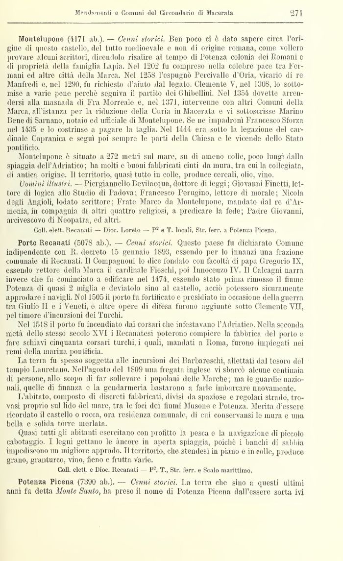 Potenza Picena (7390 ab.). — Cenni storici. La terra che sino a questi ultimi anni fu detta Monte Santo, ha preso il nome di Potenza Picena dall'essere sorta ivi