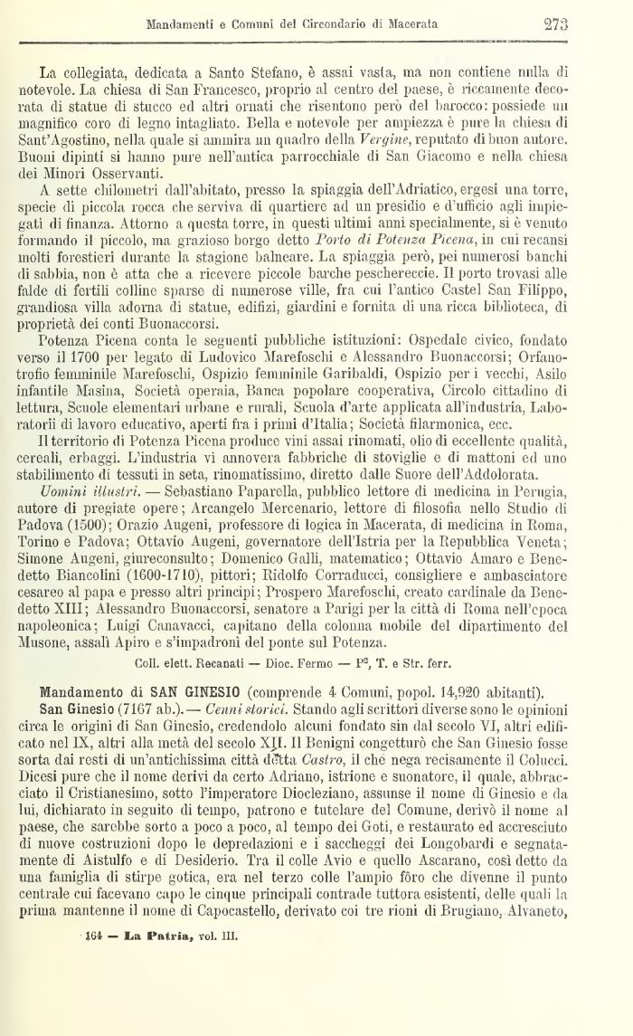 Uomini illustri. — Sebastiano Paparella, pubblico lettore di medicina in Perugia, autore di pregiate opere ; Arcangelo Mercenario, lettore di filosofia nello Studio di Padova (1500); Orazio Augeni, professore di logica in Macerata, di medicina in Roma, Torino e Padova; Ottavio Augeni, governatore dell'Istria per la Repubblica Veneta; Simone Augeni, giureconsulto ; Domenico Galli, matematico; Ottavio Amaro e Benedetto Biancolini (1G0U-J710), pittori; Ridolfo Corradi!cci, consigliere e ambasciatore cesareo al papa e presso altri principi; Prospero Marefoschi, creato cardinale da Benedetto XIII ; Alessandro Buonaccorsi, senatore a Parigi per la città di Roma nell'epoca napoleonica; Luigi Canavacci, capitana della colonna mobile del dipartimento del Musone, assalì Api» e s'impadronì del ponte sul Potenza.