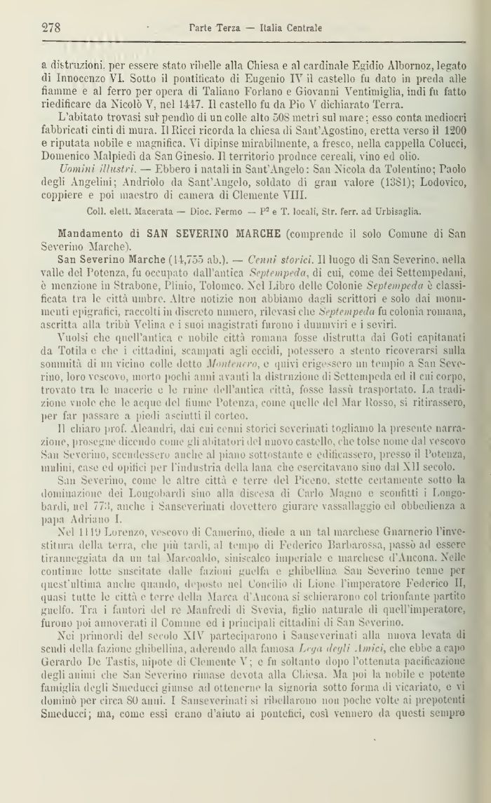 San Severino Marche (14,755 ab.). — Cenni storici. Il luogo di San Severino nella valle del Potenza, fu occupato dall'antica Septempeda, di cui, come dei Settempedani, ò menzione in Strabene, Plinio, Tolomeo. Nel Libro delle Colonie Septempeda è classificata tra le città umbre. Altro notizie non abbiamo dagli scrittori e solo dai monumenti epigrafici, raccolti in discreto numero, rilevasi che Septempeda fu colonia romana, ascritta alla tribù Velina e i suoi magistrati furono i duumviri e i seviri.