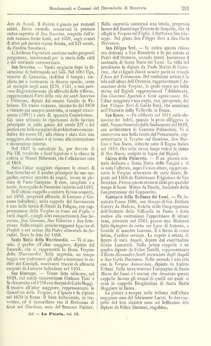 San Severino. — Vuoisi originata dopo la distruzione di Settempeda nel 545. Nel 1061 Ugo, vescovo di Camerino, riedificò il tempio ; ampliato poi c restaurato in diverse epoche, come ad esempio negli anni 1576, 1741, e così perirono disgraziatamente gli affreschi della tribnna, rappresentanti Fatti della vita dei santi Severino e Vittorino, dipinti dal sommo Gentile da Fabriano. Un nuovo restauro, iniziato fin dal 1859 e rimasto poi sempre interrotto, si compiè attualmente (1897) a cura di apposita Commissione. Già sono ultimate le. riparazioni della facciata principale in isfile gotico del secolo XIV e del postico con belli esemplari di architettura romano-italica del secolo XI; alla chiesa è stata data una maggiore elevazione e si lavora alla sistemazione e decorazione interna.