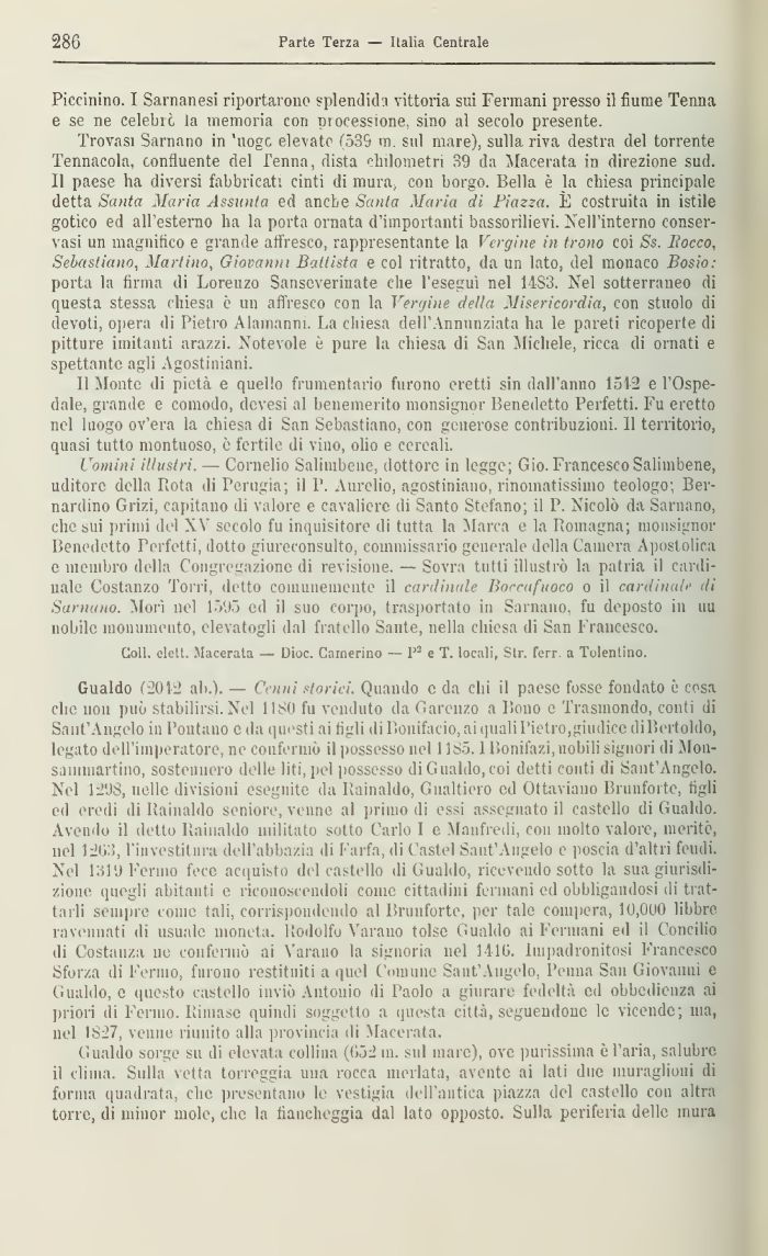 Gualdo (201-2 ab.). — Cenni storici. Quando e da chi il paese fosse fondato è cosa che non può stabilirsi. Nel 1180 fu venduto da Garenzo a Bono e Trasmondo, conti di Sant'Angelo in Pontano e da questi ai figli dì Bonifacio, ai quali Pietro,giudice di Bertoldo, legato dell'imperatore, ne confermò il possesso nel 1185.1 Bonilazi, nobili signori di Mon-saiumartiiio, sostennero delle liti, pel possesso di Gualdo, coi detti conti di Sant'Angelo. Nel 1298, nelle divisioni eseguite da Kainahlo, Gualtiero ed Ottaviano Brunforte, figli ed eredi di Kainahlo seniore, venne al primo di essi assegnato il castello di Gualdo. Avendo il detto Kainahlo militato sotto Carlo I e Manfredi, con molto valore, meritò, nel 120:1, rinvestitura dell'abbazia di Farfa, di Castel Sant'Angelo e poscia d'altri feudi. Nel 1319 Ferino fece acquisto del castello di Gualdo, ricevendo sotto la sua giurisdizione quegli abitanti e riconoscendoli come cittadini ferinani ed obbligandosi di trattarli sempre come tali, corrispondendo al Brunforte, per tale compera, 10,000 libbre ravennati di usuale moneta. Rodolfo Varano tolse Gualdo ai Permani ed il Concilio di Costanza ne confermò ai Varano la signoria nel Miti, luipudroiiitos. Francesco Sforza di Fermo, furono restituiti a quel Comune Sant'Angelo, Penna San Giovanni e Gualdo, e questo castello inviò Antonio di Paolo a giurare fedeltà ed obbedienza ai priori di Fermo. Rimase quindi soggetto a questa città, seguendone le vicende; ma, nel 1827, venne riunito alla provincia di Macerata.