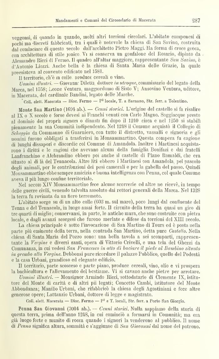 Monte San Martino (1G94 ab.). — Cenni storici. L'origine del castello si fa risalire al IX o X secolo e forse devesi ai Franchi venuti con Carlo Magno. Soggiacque presto al dominio dei proprii signori o dinasti fin dopo il 1240 circa e nel 1250 si stabilì pienamente la sua Comunità indipendente. Nel 1248 il Comune acquistò il Collegio di Scheggia da Commanno di Guarniero, con tutto il distretto, vassalli e signoria e gli uomini furono obbligati a trasferirsi in Monsammartino. Questa compera fu cagione di lunghi dissapori e discordie col Comune di Amandola. Inoltre i Martinesi acquistarono i diritti e le ragioni che avevano alcuni della famiglia Bonifazi e dai fratelli Lanfranchino e Alebrandino ebbero poi anche il castello di Plano Romaldi, che era situato al di là del Tennacola. Altre liti ebbero i Martinesi con Amandola, pel pascolo degli animali, per le contribuzioni dei pesi camerali e per la gabella del passo. Quindi Monsammartino ebbe sempre amicizia e buona intelligenza con Penna, col quale Comune aveva il piti lungo confine territoriale.