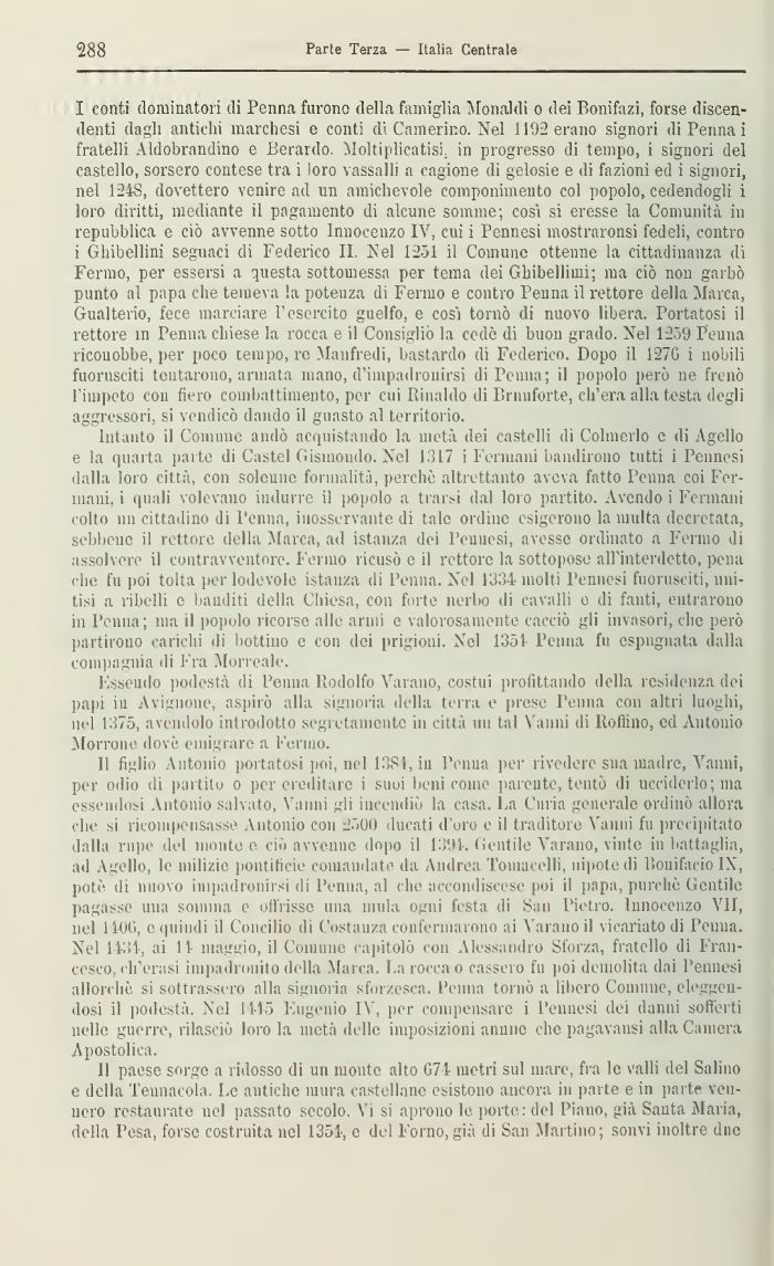 11 figlio Antonio portatosi poi, nel 1381, in Penna per rivedere sua madre, Vanni, per odio di partito o per ereditare i suoi beni come parente, tentò di ucciderlo; ma essendosi Antonio salvato, Vanni gli incendiò la casa. La Curia generale ordinò allora che si ricompensassi? Antonio con 2500 ducati d'oro e il traditore Vanni fu precipitato dalla rupe del monto e. ciò avvenne dopo il 1391-. Gentile Varano, vinte in battaglia, ad Agello, le milizie pontificie comandate da Andrea Toinacelli. nipote dì Bonifacio IX, potè di nuovo impadronirsi di Penna, al che accondiscese poi :l pftpa, purché Gentile pagasse una somma e offrisse una inula ogni festa di San Pietro. Innocenzo VII, nel 1400, «quindi il Concilio di Costauza confermarono ai V'arano il vicariato di Peuna. Xel 1434, ai 11- maggio, il Comune capitolò con Alessandro Sforza, fratello di Francesco, ( h'erasi impadronito della Marca. I.a rocca o cassero fu poi demolita dai Pennesi allorché si sottrassero alla signoria sforzesca. Penna tornò a libero Comune, eleggendosi il podestà. Xel 11-15 Eugenio IN, per compensare i Pennesi dei danni sofferti nelle guerre, rilasciò loro la metà delle imposizioni anime che pagavansi alla Camera Apostolica.
