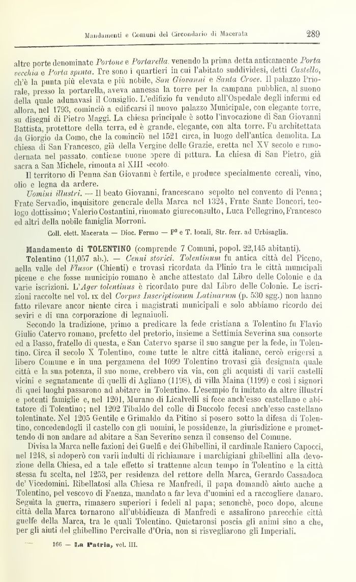 Tolentino (11,057 ab.). — Cenni storici. Tolentinum fu antica città del Piceno, nella valle del Flusor (Chienti) e trovasi ricordata da Plinio tra le città municipali picene e che fosse municipio romano è anche attestato dal Libro delle Colonie e da varie iscrizioni. L'Ager tolentinus è ricordato pure dal Libro delle Colonie. Le iscrizioni raccolte nel voi. ìx del Corpus Jnscriptionum Latinorum (p. 530 sgg.) non hanno fatto rilevare ancor niente circa i magistrati municipali e solo abbiamo ricordo dei seviri e di una corporazione di legnaiuoli.