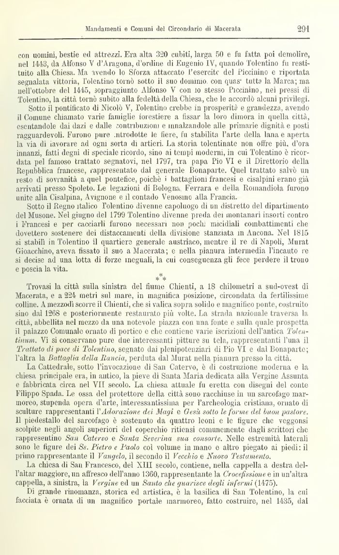 Sotto il pontificato di Nicolò V, Tolentino crebbe in prosperità e grandezza, avendo il Comune chiamato varie famiglie forestiere a fissar la loro dimora in quella città, esentandole dai dazi e dalle iontnbuzioni e innalzandole alle primarie dignità e posti ragguardevoli. Furono pure .ntrodotte le fiere, fu stabilita l'arte della lana e aperta la via di lavorare ad ogni sorta di artieri. La storia tolentinate non offre più, d'ora innanzi, fatti degni di speciale ricordo, sino ai tempi moderili, in cui Tolentino è ricordata pel famoso trattato segnatovi, nel 1797, tra papa Pio VI e il Direttorio della Repubblica francese, rappresentato dal generale Bonaparte. Quel trattato salvò un resto di sovranità a quel pontefice, poiché i battaglioni francesi e cisalpini erano già arrivati presso Spoleto. Le legazioni di Bologna, Ferrara e della Romandiola furono unite alla Cisalpina, Avignone e il contado Venosino alla Francia.