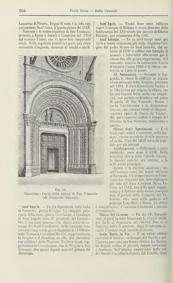 SS. Annunziata. — Secondo la leggenda, la chiesa fu edificata in seguito ad un miracolo della Vergine, avvenuto nel 1 104. Il duca Giammaria Varano e la Cibo fecero poi erigere la chiesa, che ha una facciala bella nella sua sempli-cilà, con portale arehilellato sul gusto di quello Ji San Venanzio. Buona è anche l'arcliikllura e la disposizione interim, con colonne svelle ed eleganti, reputala opera di Rocco ila Vicenza, che poco appresso edificò il (empio del Glorioso in San Severino, siili i 1 issi ino a questo.