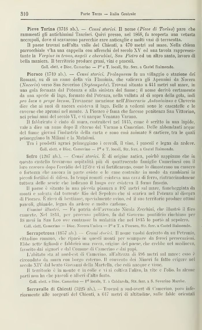 Pioraco (1749 ab.). — Cenni storici. Prolaqueitm fu un villaggio o stazione dei Romani, su di un ramo della via Flaminia, che valicava gli Apennini da Nocera (Nuceria) verso San Severino (Septevipeda). Trovasi situato a 441 metri sui mare, in una gola formata dal Potenza e alla sinistra del fiume ; il nome derivò certamente da una specie di lago, formato dal Potenza, nella vallata al di sopra della gola, indi prò luca o prope Iacinti. Trovasene menzione rie\VItinerario Antoniniano e Oliverio dice che ai suoi dì ancora esisteva il lago. Belle a vedersi sono le cascatelle e le caverne che apronsi nel monte. V Pioraco e fama clic facesse penitenza San A ittorino, nei pillili anni del secolo VI, e vi nacque Venanzo Varano.