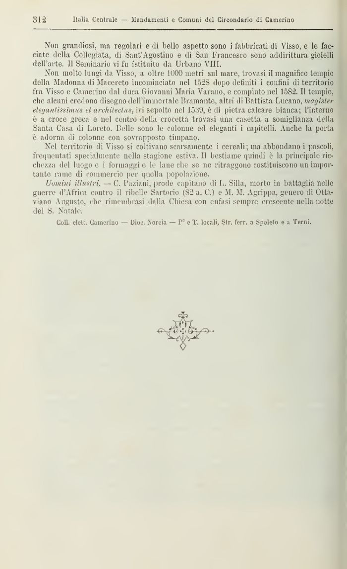 Non molto lungi da Visso, a oltre 1000 inetri sul mare, trovasi il magnifico tempio della Madonna di Macereto incominciato nel 1528 dopo definiti i confini di territorio fra Visso e Camerino dal duca Giovanni Maria Varano, e compiuto nel 15S2. Il tempio, che alcuni credono disegno dell'immortale Bramante* altri di Battista Lucano, magister elegantissimus et arckitectus, ivi sepolto nel 1539, è di pietra calcare bianca; l'interno è a croce greca e nel centro della crocetta trovasi una casetta a somiglianza della Santa Casa di Loreto. Belle sono le colonne ed eleganti i capitelli. Anche la porta è adorna di colonne con sovrapposto timpano.