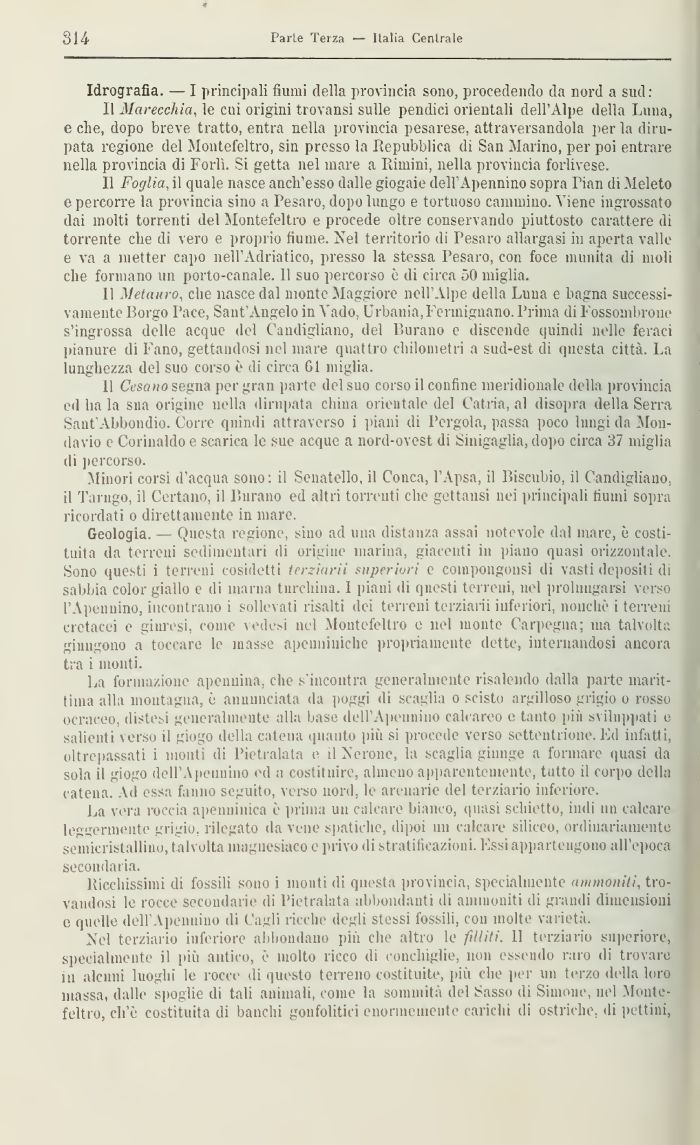 Nel terziario inferiore abbondano più che altro le fili iti. Il terziario superiore, specialmente il più antico, è molto ricco di conchiglie, non essendo raro di trovare in alcuni luoghi le rocce di questo terreno costituite, più che per mi terzo della loro massa, dalle spoglie di tali animali, come la sommità del Sasso di Simone, nel Monte-feltro, ch'è costituita di banchi gonfolitici enormemente carichi di ostriche, di pettini,