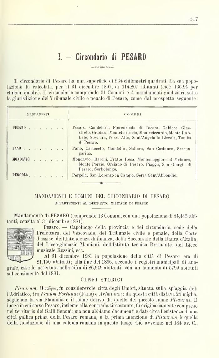 Mandamento di PESARO (comprende 13 Comuni, con una popolazione di 44,445 abitanti, censita al 31 dicembre 1881).