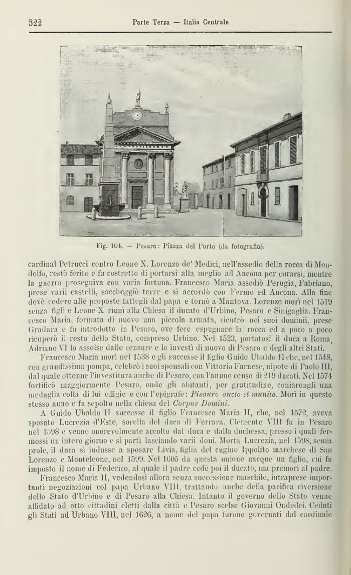 Francesco Maria mori nel 1538 egli successe il tiglio Guido Ubaldo 11 che,nel 1518, con grandissima pompa, celebrò i suoi sponsali con Vittoria Farnese, nipote di Paolo Ili, dal iiuale ottenne l'investitura anche dì Pesaro, con l'annuo censo di 219 ducati. Nel 1571-fortiiicò maggiormente Pesaro, onde gli abitanti, per gratitudine, coniarongli una medaglia colla di lui effigie e con l'epigrafe: Pisauro mieto et munito. Morì in questo stesso aiuto e fu sepolto nella chiesa del Corpus Domini.