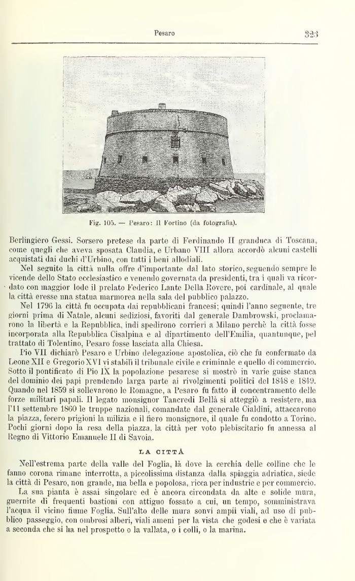 Nell'estrema parte della valle del Foglia, là dove la cerchia delle colline che le fanno corona rimano interrotta, a piccolissima distanza dalla spiaggia adriatica, siede la città di Pesaro, non grande, ma bella e popolosa, ricca per industrie e per commercio.