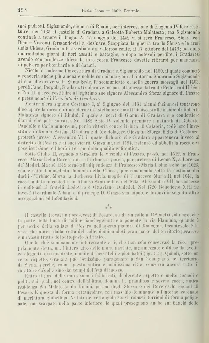 Quello ch'I .sommamente interessante si è, che non solo conservasi la rocca propriamente detta, ma l'intero giro delle mura merlate, intramezzate e difese da svelte ed (deganlì torri quadrate, immite di beccatelli e piombatili (lig. 113). Quindi, sotto un ci-ito rispetto Gradara può benissimo paragonarsi a San Gemigiiano nel territorio di Siena, perchè, come questa antica e nobilissima città, conserva ancora tutto il carattere ch'ebbe sino dai tempi dell'età di mezzo.