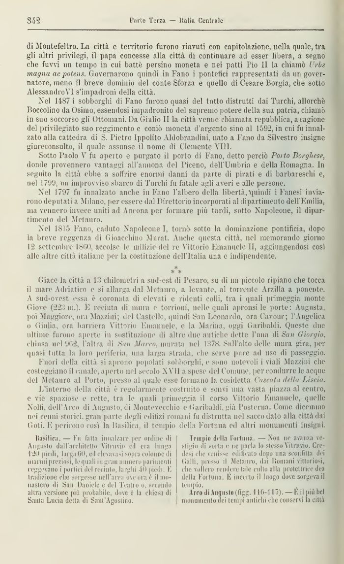 Giace la città a DI chilometri a sud-est di Pesaro, su di un piccolo ripiano che tocca il mare Adi iatico e si allarga dal Mctanro, a levante, al torrente rivalla a ponente. A sud-ovest essa è coronata di elevati e ridenti colli, tra i quali primeggia monte Giove (221! in.). È recinta di mura e torrioni, nelle quali apronsi le porte: Augusta, poi Maggiore, ora Mazzini; del Castello, quindi San Leonardo, ora Cavour; 1 Vngelica o Giulia, ora barriera Vittorio Emanuele, e la Manna, oggi Garibaldi. Queste due ultime furono aperte in sostituzione di altre due antiche dette l'ima di San Giorgio, chiusa nel 9(12, l'altra di San Marco, munita nel KÌ78. Sull'alto delle mura gira, per quasi tutta la loro periferia, una larga strada, che serve pure ad uso d passeggio.