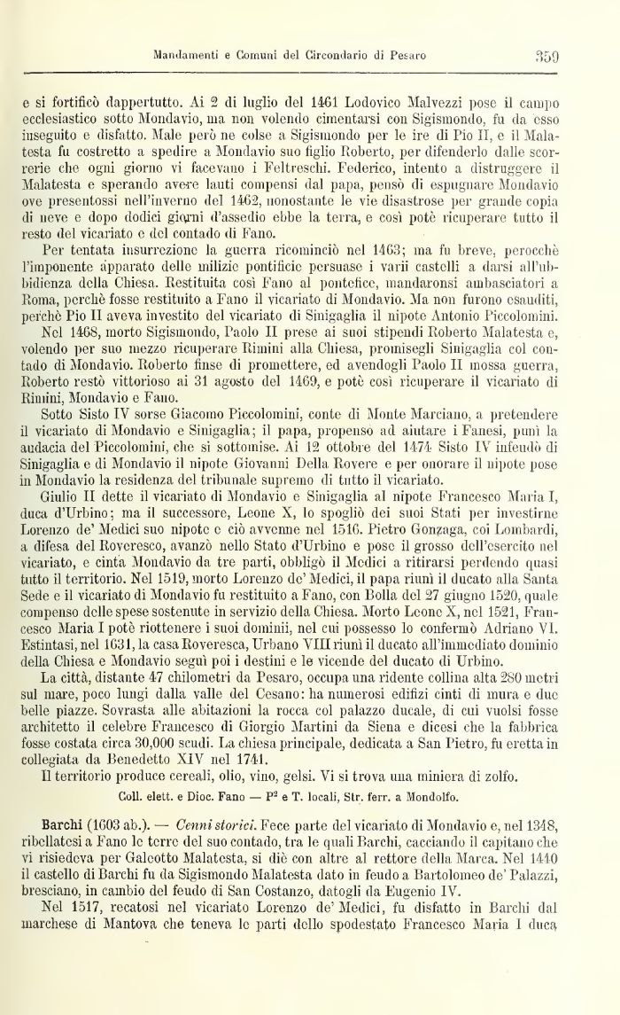 e si fortiticò dappertutto. Ai 2 di luglio del 1461 Lodovico Malvezzi pose il campo ecclesiastico sotto Mondavi», ma non volendo cimentarsi con Sigismondo, fu da esso inseguito e disfatto. Male però ne colse a Sigismondo per le ire di Pio II, e il Mala-testa fu costretto a spedire a Mondavio suo figlio Roberto, per difenderlo dalle scorrerie che ogni giorno vi facevano i Feltreschi. Federico, intento a distruggere il Malatesta e sperando ave-re lauti compensi dal papa, pensò di espugnare Mondavio ove presentossi nell'inverno del 1462, nonostante le vie disastrose per grande copia di neve e dopo dodici gkvrni d'assedio ebbe la terra, e così potè ricuperare tutto il resto del vicariato e del contado di Fano.