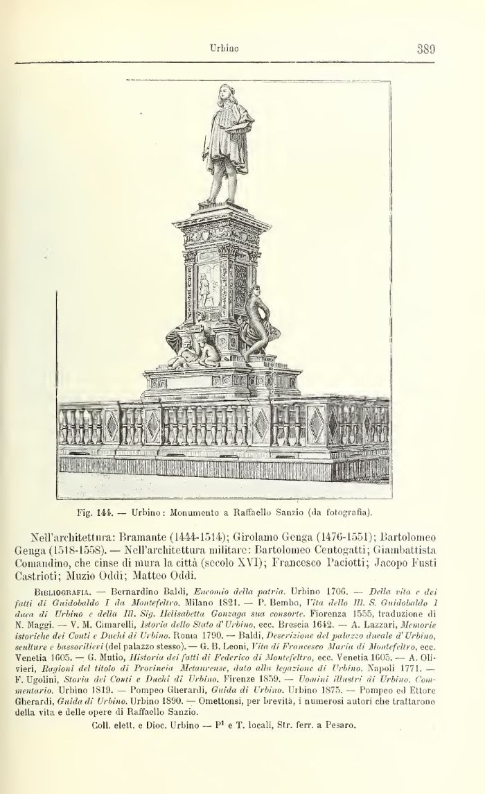 BtBMOGRAElA. — Bernardino Baldi, Eneo/ìlio della patria. Urbino 170G. ¦ Della vita e dei fatti di Guidubuldo I da Montefeltro. Milano ISSI. — P. Berillio, l'ita dello III S. Guidobaldo 1 elaea di Urbino e della III. Sig. llelisabetta Gonzaga sita consorte. Fiorenza 1555, traduzione di N. Maggi. — V. M. Cimarelli, Istoria dello Stato d'Urbino, ecc. Brescia 1012. — A. Lazzari, Memorie istoriehe dei Conti e Ditelli di Urbino. Roma 1790. — Baldi, Descrizione del jìalazzo ducale d'Urbino, sculture e bassorilievi (del palazzo stesso). — (r. B. Leoni, Vita di Francesco Maria eli Montefeltro, ecc. Venetia 1G05. — lì. Mutio, Historiu dei fatti di Federico di Montefeltro, ecc. Venetia ltiOo. — A. Oli vieri. Ragioni del titolo di Provincia Metaurense, dato alla legazione di Urbino. Napoli 1771. — F, Ugolini, Storia dei Conti e Duchi di Urbino. Firenze 1859. — Uomini illustri di Urbino. Commentario. Urlmio 1S19. — Pompeo Gherardi, Guida di Urbino. Urbino 1S75, — Pompeo ed Ettore Gherardi, Guida di Urbino. Urbino ISSO. Omettonsi, per brevità, i numerosi autori che trattarono della vita e delle opere di Raffaello Sanzio.