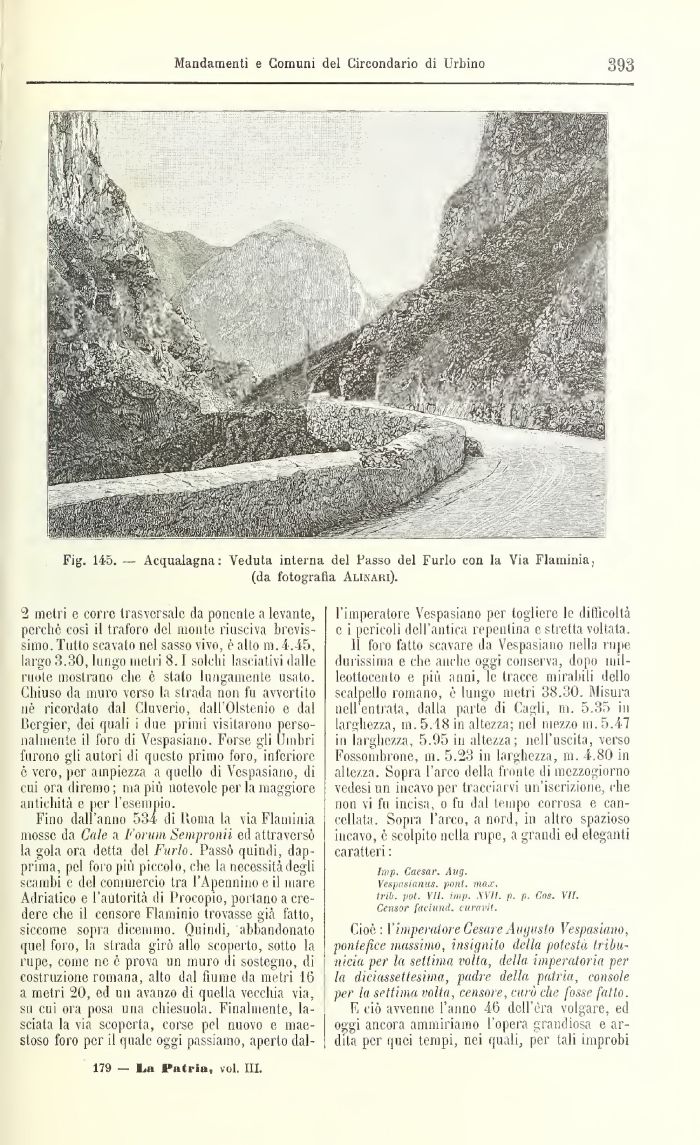 11 foro fatto scavare da Vespasiano nella rupe durissima e che anche oggi conserva, dopo uni leotlocenlo e più anni, le tracce mirabili dello scalpello romano, è lungo metri 38.30. Misura nell'entrata, dalla parte di Cagli, m. 5.35 in larghezza, in. 5.48 in altezza; nel mezzo m.5.47 in larghezza, 5.95 in altezza; nell'uscita, verso Fossombrone, in. 5.23 in larghezza, ni. 4,80 in altezza. Sopra l'arco della fronte di mezzogiorno vedesi un incavo per tracciarvi un'iscrizione, che non \i fu incisa, o fu dal tempo corrosa e cancellata. Sopra l'arco, a nord, in altro spazioso incavo, e scolpito nella rupe, a grandi ed eleganti caratteri :