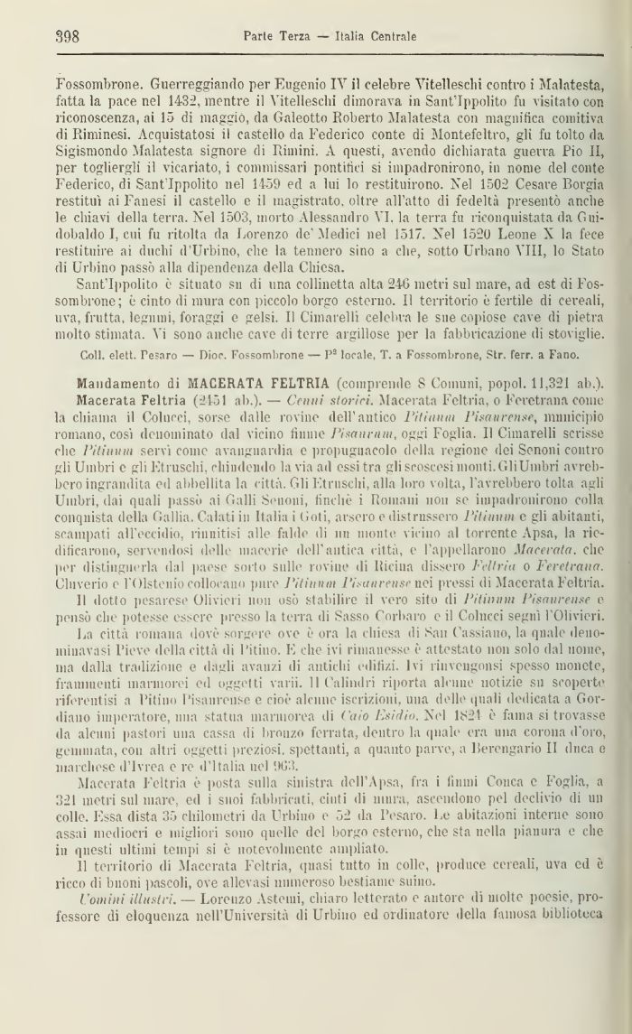 Macerata Feltria (2451 ab.). — Cenni storici. Macerata Feltria, o Feretrana come la chiama il Colueci, sorse dalle rovine dell'antico Pitinum Pisaurcnse, municipio romano, così denominato dal vicino fiutne Pisa uni ut, og^i Foglia. Il Cimarelli scrisse che PitiHiim servì come avanguardia e propugnacelo della regione dei Senoni contro gli Umbri e gli Etruschi, chiudendo la via ad essi tra gli scoscesi monti. Gli Umbri avrebbero ingrandita ed abbellita la città. Gli Etruschi, alla loro volta, l'avrebbero tolta agli Umbri, dai quali passò ai Galli Senoni, finché i Romani uoii se impadronirono colla conquista della Gallia. Calati in Italia i Goti, arsero e distrussero Pitinmn e gli abitanti, scampati all'eccidio, riunitisi alle falde ili 1111 monte vicino al torrente Apsa, la riedificarono, servendosi delle macerie dell'antica città, e l'appellarono Macerata, che per distiugin rla dal paese sorto sulle rovine di Rieiua dissero Feltria o Feretrana. Cluverìa e l'Olstenio collocano pure Pitiunm Pisatiremt nei pressi di Macerata Feltria.