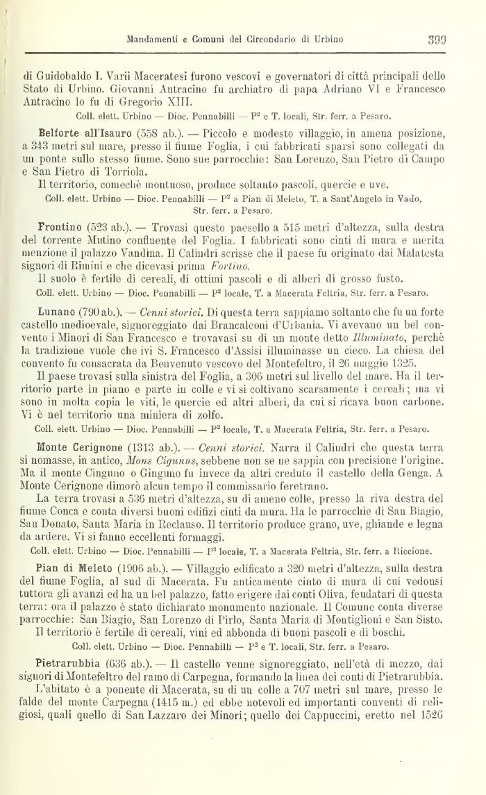 Coli, elett. Urbino — Dioc. Pennabiili — P2 locale, T. a Macerata Feltria, Str. ferr. a Pesaro.