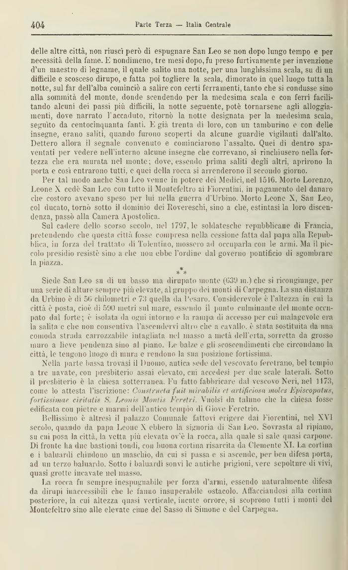 delle altre città, non riusci però di espugnare San Leo se non dopo lungo tempo e per necessità della fame. E nondimeno, tre mesi dopo, fu preso furtivamente per invenzione d'un maestro di legname, il quale salito una notte, per una lunghissima scala, su di un difficile e scosceso dirupo, e fatta poi togliere la scala, dimorato in quel luogo tutta la notte, sul far dell'alba cominciò a salire con certi ferramenti, tanto che si condusse sino alla sommità del monte, donde scendendo per la medesima scala e con ferri facilitando alcuni dei passi più difficili, la notte seguente, potè tornarsene agli alloggiamenti, dove narrato l'accaduto, ritornò la notte designata per la medesima scala, seguito da centocinquanta fanti. E già trenta di loro, con un tamburino e con delle insegne, erano saliti, quando furono scoperti da alcune guardie vigilanti dall'alto. Dettero allora il segnale convenuto e cominciarono l'assalto. Quei di dentro spaventati per vedere nell'interno alcune insegne che correvano, si rinchiusero nella fortezza che era murata nel monte; dove, essendo prima saliti degli altri, aprirono la porta e cosi entrarono tutti, e quei della rocca si arrenderono il secondo giorno.
